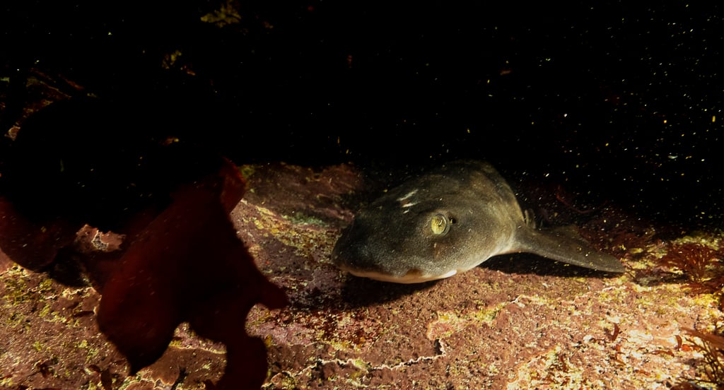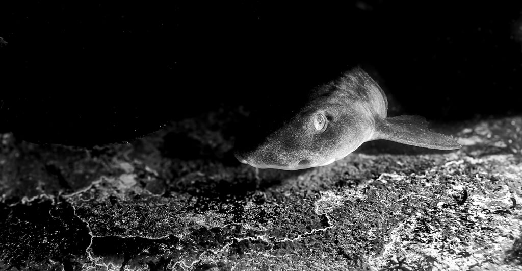 Take the dark shyshark emerging from the kelp forest. In full colour, we see the rusty browns of the kelp, the mottled greys and tans of the shark, the deep green-blue of the water. It's a nice nature photograph. But does it capture the essence of what this moment really represents, that heart-stopping instant when a predator materialises from the shadows?