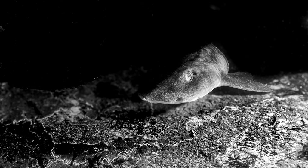 The Emerging Subject: Stripped of colour distractions, the shark's form becomes pure sculpture. Its smooth curves contrast dramatically with the textured environment, while strategic lighting emphasises that piercing eye, the moment of recognition between predator and observer. The eye is key in this image, as it is when we, both shark and photographer, visually meet: one comfortable and natural, the other, holding its breath, confined in a wetsuit mask on its face, looking quite alien to the other.